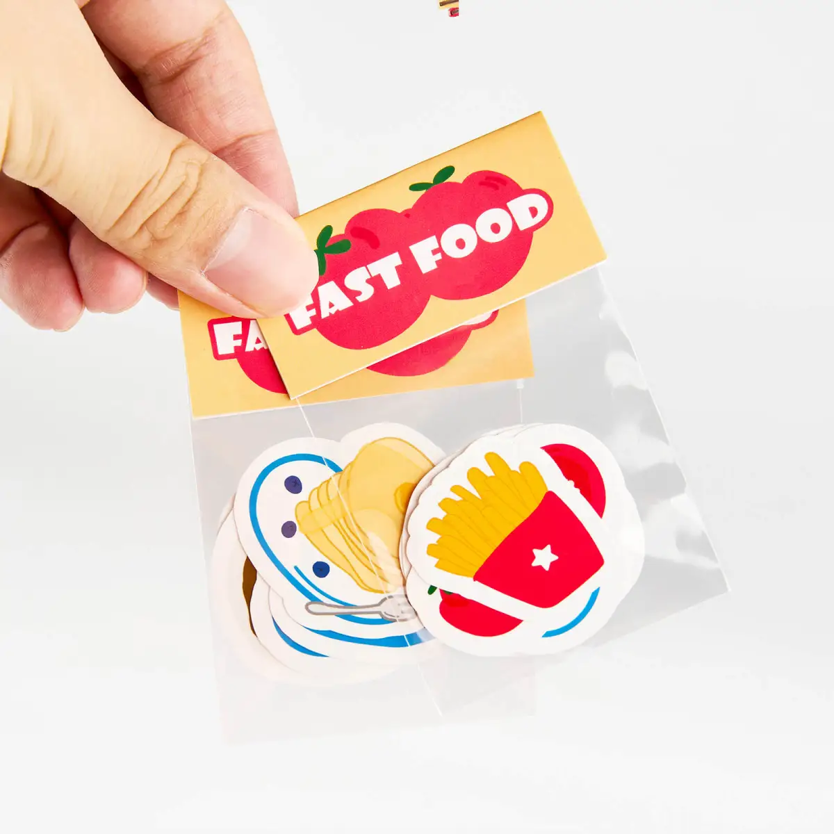 Sturdy clear bags protect stickers while being recyclable, with a low minimum of just 5 packs.